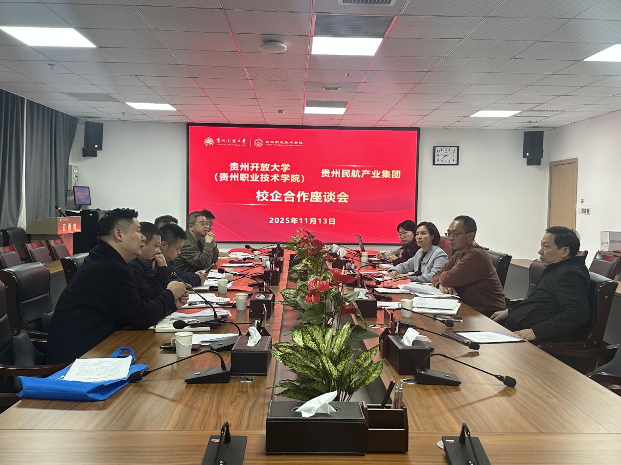 11月13日,贵州民航产业集团战略投资部经理周纪、财务管理部核算经理舒俊、贵州临空经济发展公司副总经理姚茂春、贵州民航教育公司副总经理郑浩然到校就进一步深化校企合作的内容进行交流洽谈。校企合作与产业发展中心、实训中心主任张杰,航空学院院长王崇刚、万翔(企业),商贸学院院长袁德臻参加,会议由王崇刚主持。
