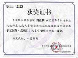 2023年学院学生在互联网+大学生创新创业大赛、全国“创新创意及创业”大赛、贵州省技能大赛等比赛中,取得国家二等奖1项,国家三等奖1项,省级一等奖7项,二等奖7项,三等奖18项。