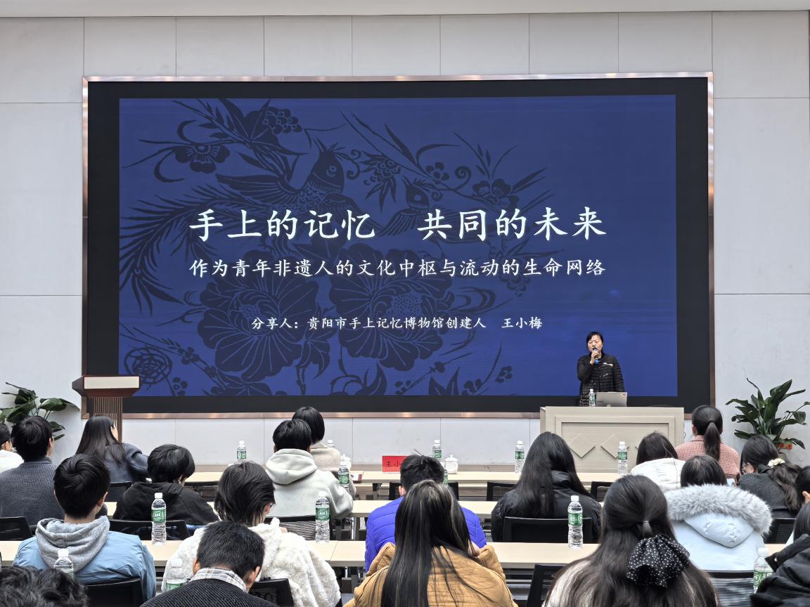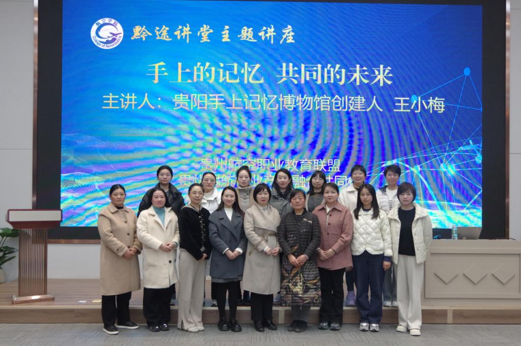 12月16日下午,航空学院“黔途讲堂”系列讲座邀请到贵阳手上记忆博物馆创始人、深度文化记者王小梅开展《手上的记忆 共同的未来》主题讲座,带师生走进贵州非遗,分享文化传承的实践智慧与青年担当。航空学院副院长张艳与旅游管理、空中乘务专业的师生代表共同聆听讲座。