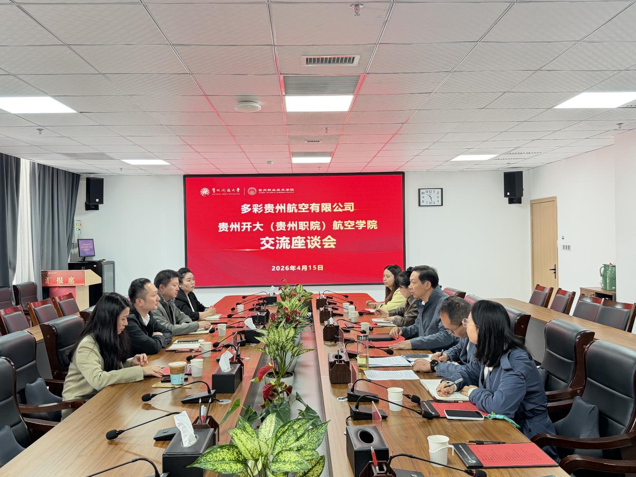 为深入推进产教融合、校企协同育人,进一步完善学生实习就业保障体系、拓展社会化培训路径,4月15日,多彩贵州航空有限公司客舱服务部副总经理李广慧一行到校交流,航空学院党委书记张杰、院长王崇刚,以及学院相关科室、教研室负责人及骨干教师参加了本次座谈会。