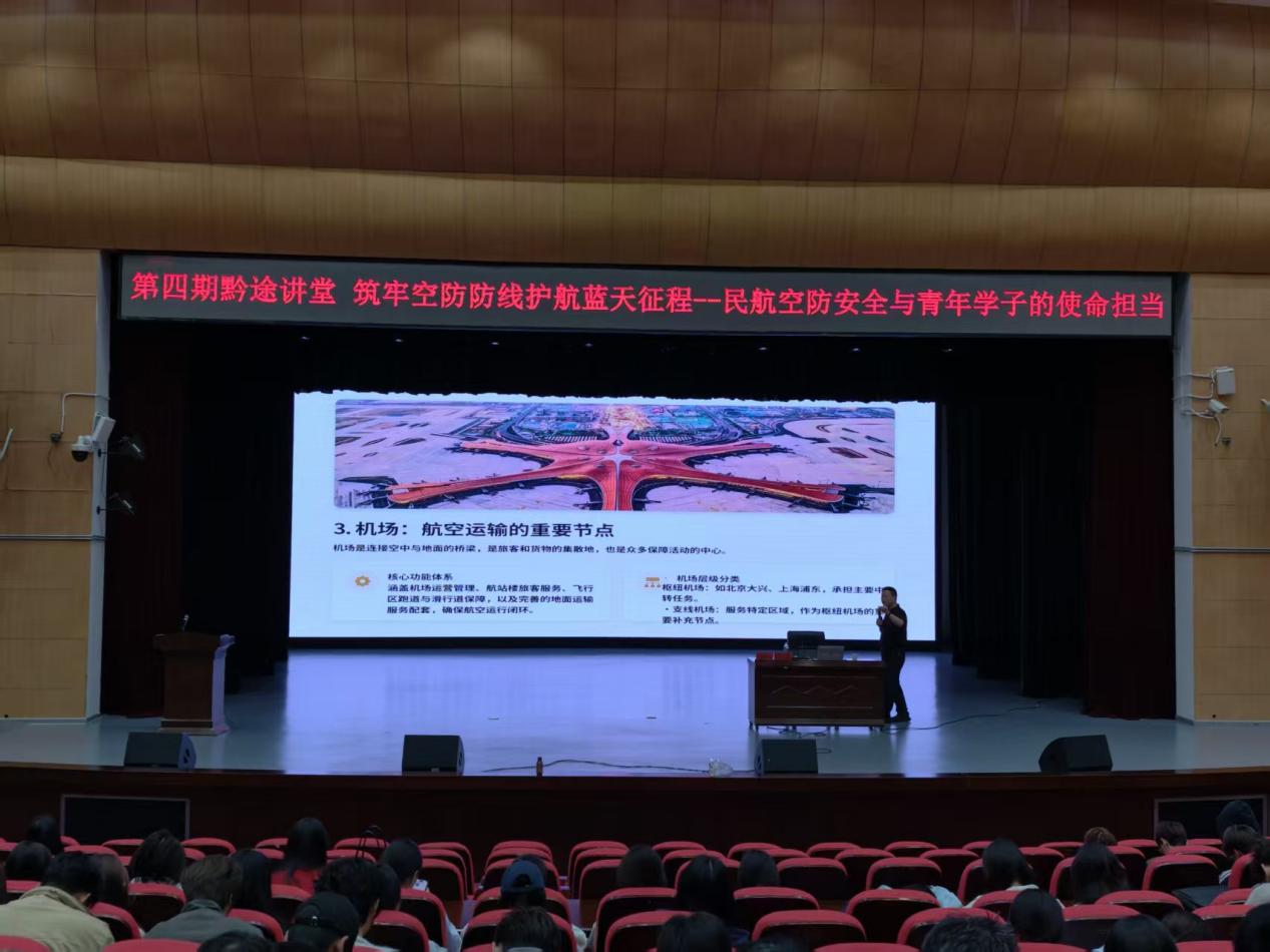 蓝天之上,安全为要;空防之下,使命在肩。为进一步强化学子空防安全意识,明晰青年民航人的责任与担当,4月17日,由贵州民航行业产教融合共同体主办,航空学院承办的第四期“黔途讲堂”邀请到民航贵州监管局空防处处长华山作专题讲座。航空学院班子成员及民航安全技术管理、空中乘务、应急救援技术专业师生参会聆听。