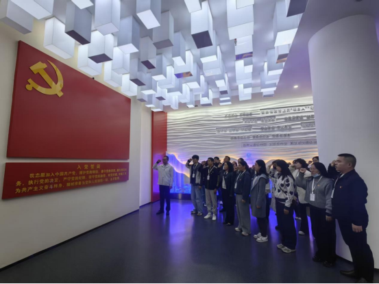 参观结束后,在院长王崇刚的带领下,全体党员面对党旗,庄严重温入党誓词。铿锵誓言表达了不忘初心、牢记使命的坚定信念。